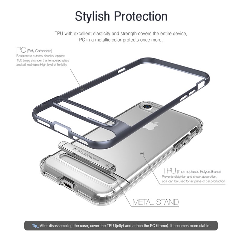 Wyjątkowo elastyczne TPU pokrywa powierzchnię telefonu, osłaniając ją z tyłu oraz po bokach. Twarda i wytrzymała ramka z polikarbonu, w metalicznym kolorze spaja całą konstrukcję tworząc doskonałą barierę przed zarysowaniem oraz skutkami wstrząsów czy uderzeń.