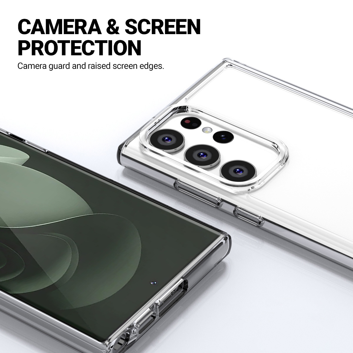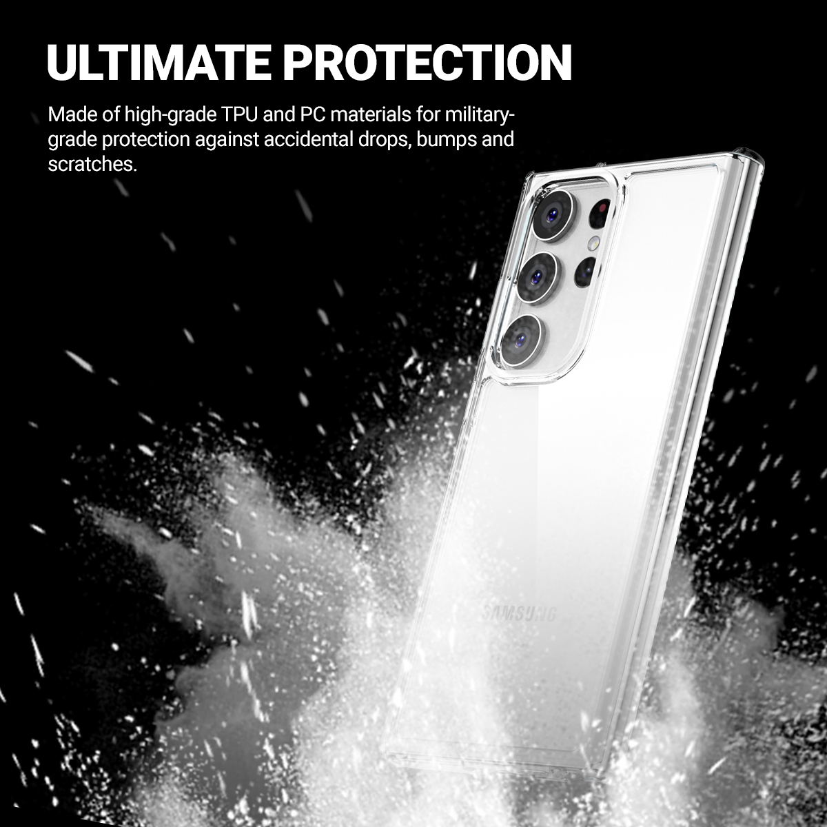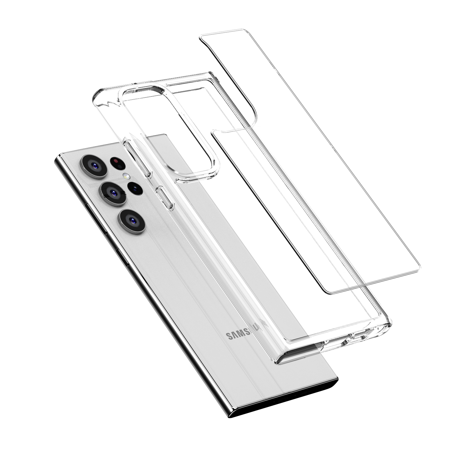 Průhledné ochranné pouzdro od společnosti Crong pro Samsung Galaxy S23 Ultra, které odhaluje a chrání jeho kryt ze všech stran. Křišťálově průhledná zadní strana z tvrdého akrylu se kombinuje s pružnými boky, které díky speciálním výztuhám Anti-Shock absorbují sílu nárazu.