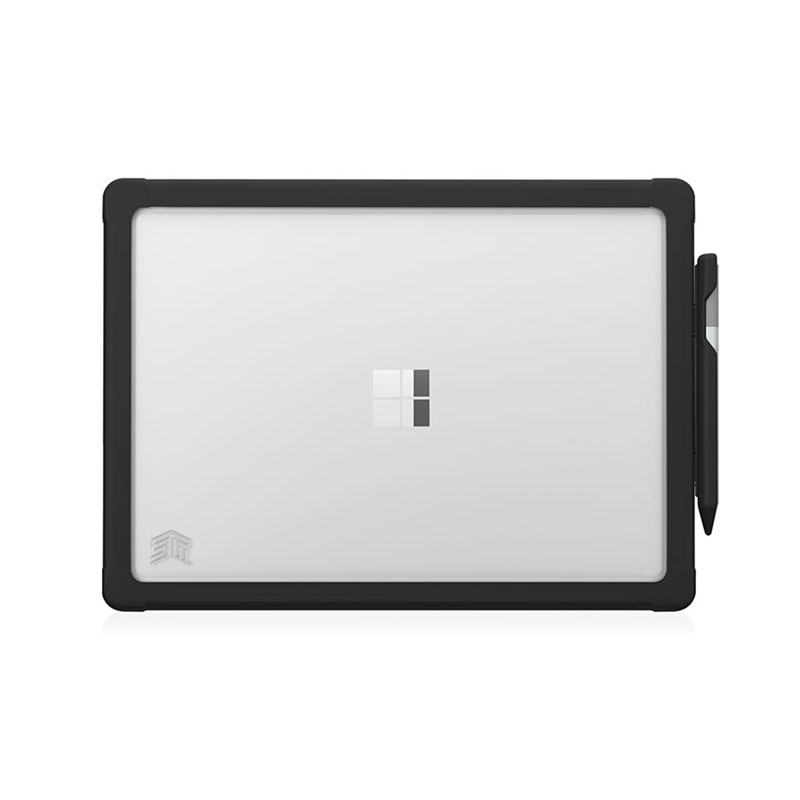 Pancerna obudowa ochronna STM Dux oferuje najwyższy poziom ochrony dla 13,5-calowych komputerów Surface Laptop. Została ona zaprojektowana w taki sposób, aby spełniać rygorystyczne wymagania standardu MIL-STD-810H w zakresie odporności na upadki z dużej wysokości. Gumowe krawędzie ze wzmacnianymi narożnikami zabezpieczają obudowę laptopa oraz klapę wyświetlacza. Teksturowane nóżki anty-poślizgowe zapewniają dodatkowo stabilną pracę na praktycznie każdej płaskiej powierzchni.