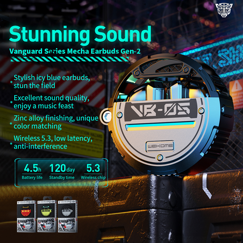 TWS WEKOME VB05 Vanguard Series wireless headphones with charging base.
