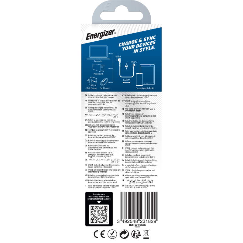 The Energizer charging and data transfer cable is 200 cm long and features a USB-A to USB-C 90° connector. The cable is L-shaped for easy plugging and unplugging.