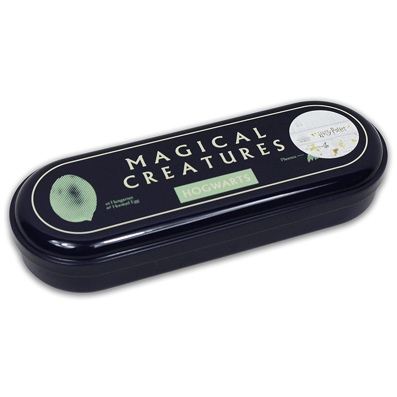 Un estuche metálico decorado con coloridos gráficos inspirados en las Criaturas Mágicas de Hogwarts. El estuche ofrece espacio suficiente para bolígrafos, ceras, lápices, sacapuntas y una regla.