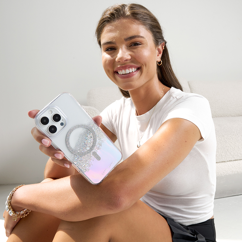 Eleganckie, półprzezroczyste etui ochronne zdobione subtelnymi płatkami srebra oraz efektem holograficznym. Holograficzne wykończenie to kolorowa, błyszcząca powierzchnia mieniąca się w świetle w zależności od kąta patrzenia i oświetlenia.