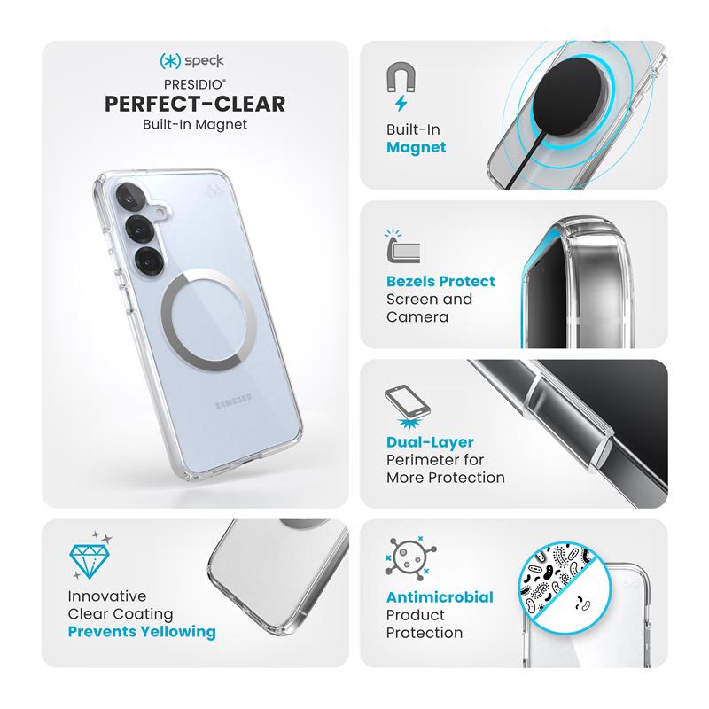 | Name des Erzeugnisses. | Speck Presidio Perfect-Clear Magnet - Hülle für Samsung Galaxy S25+ / S24+ MagSafe (Clear / Chrome Finish / Serene Silver) |